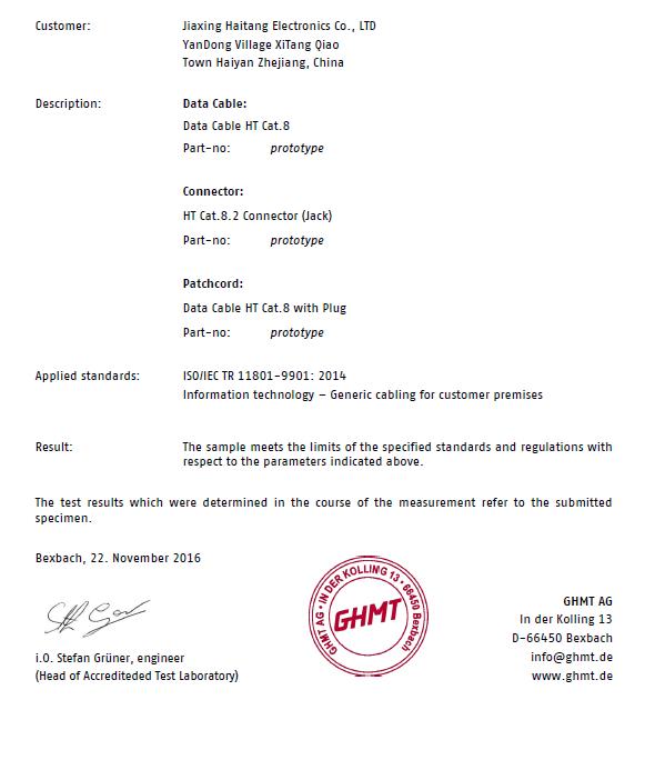 德國(guó)最權(quán)威的網(wǎng)絡(luò)通信實(shí)驗(yàn)室GHMT在2016年年初收到嘉興海棠電子有限公司的認(rèn)證樣品后整整用了6個(gè)月的時(shí)間才發(fā)了這個(gè)認(rèn)證給了嘉興海棠電子GHMT非常驚訝于嘉興海棠電子這家中國(guó)企業(yè)在這個(gè)領(lǐng)域的發(fā)展,甚至超越了德國(guó)和美國(guó)公司在這個(gè)領(lǐng)域的研發(fā)進(jìn)度,并且解決了苦惱整個(gè)行業(yè)發(fā)展的技術(shù)難題,在實(shí)驗(yàn)室測(cè)試能力極限2500MHZ的范圍內(nèi)回波損耗沒(méi)有尖峰。