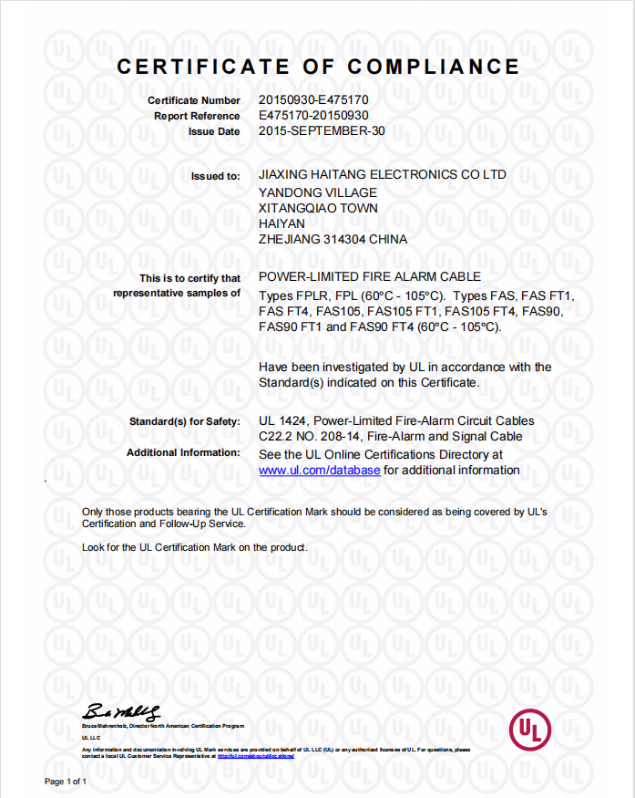 Power-Limited Fire Alarm Cable-E475170UL認(rèn)證