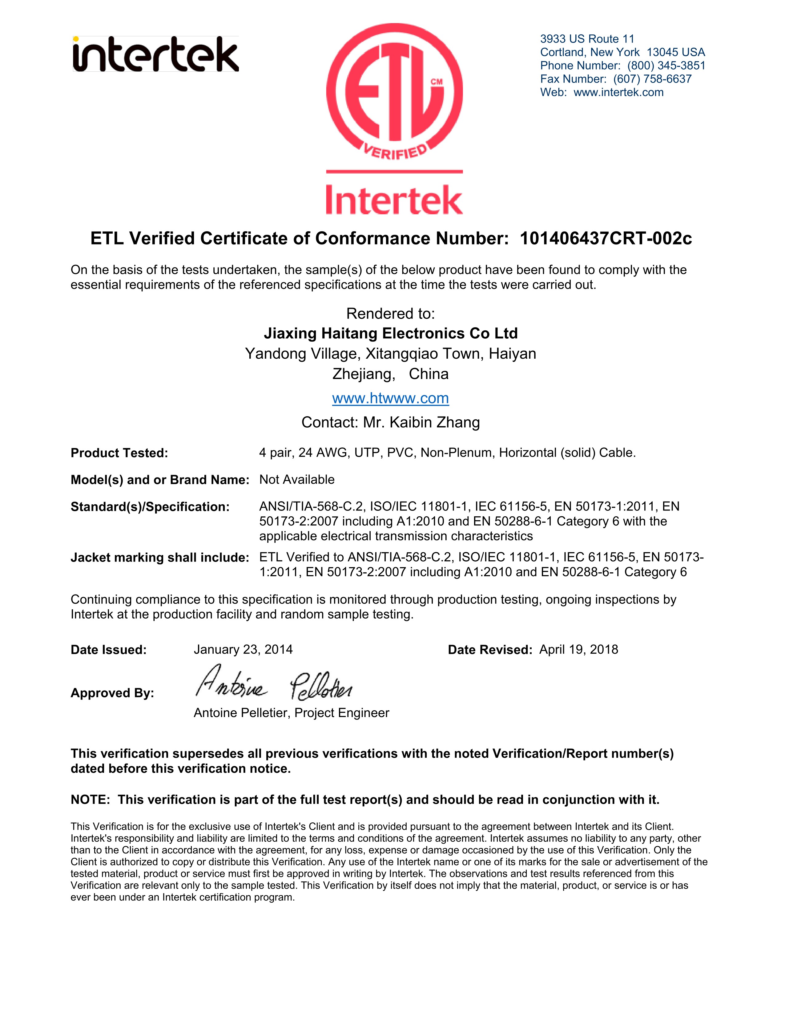 UTP CAT6 24AWG PVC ETL性能認(rèn)證